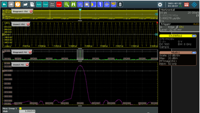 ▷脉冲功率曲线分析:脉冲包络波形信号,测量显示信号的瞬时峰值包络功率和平均功率,还有脉宽周期等时间参数。