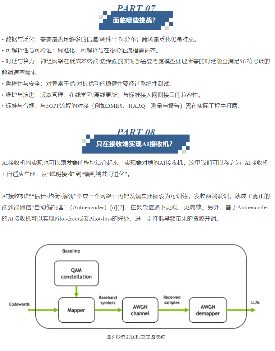 当无线链路进入高速移动、强干扰、硬件非线性和时变多径等复杂场景时,传统接收机按照“建模—估计—补偿”的流水线逐段处理,难免出现失配与累积误差。AI接收机以数据驱动为核心,把这些环节融入一个端到端可学习的模型中,更稳定地把接收波形还原成比特。